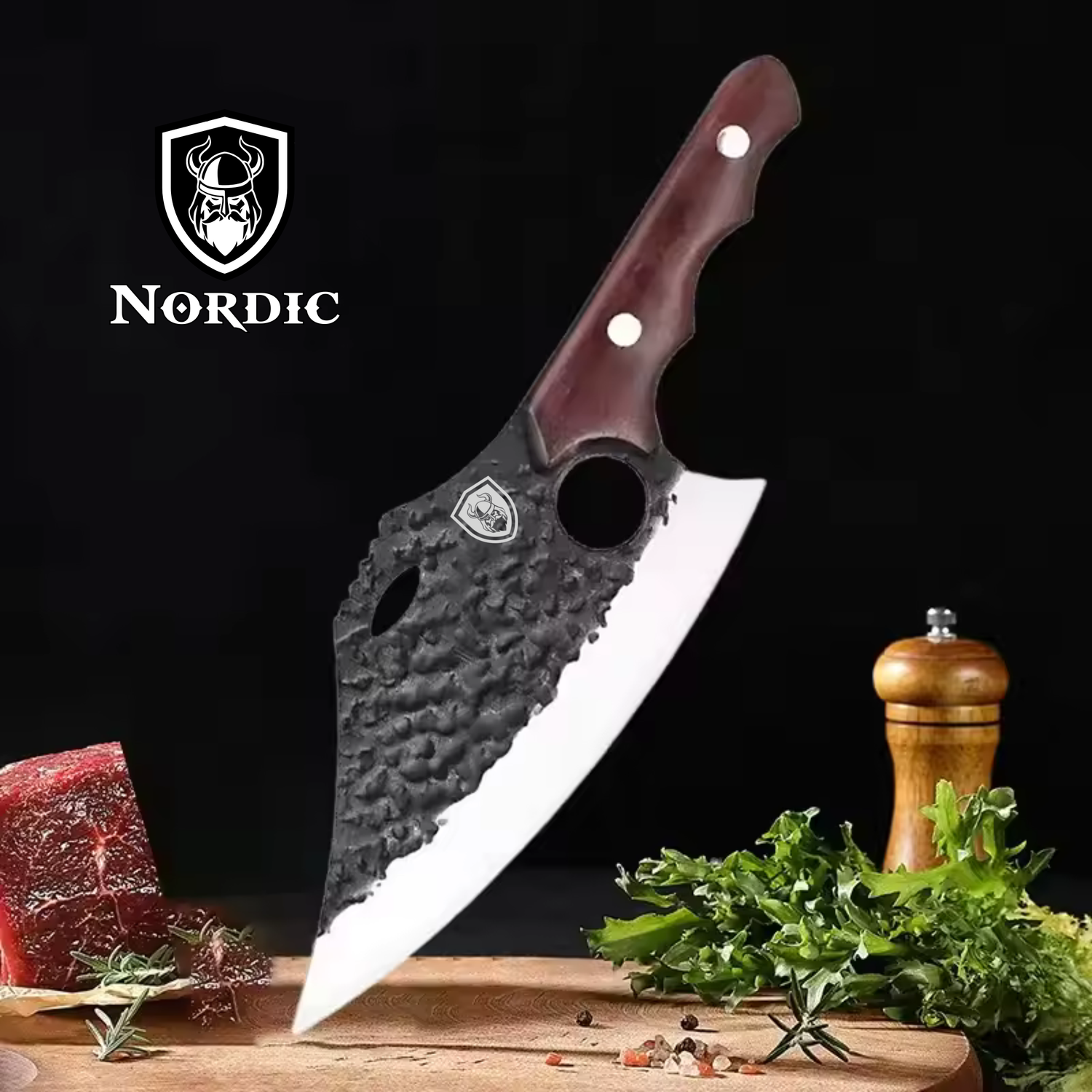 This multipurpose Nordic Viking Hand Forged Butcher Clever Knife is perfect for slicing and chopping in the kitchen or outdoors. With a full tang construction and razor-sharp blade, it easily cuts through meat, poultry, fish, and vegetables. The natural rosewood handle with rivet fittings offers a comfortable grip, while the leather sheath ensures safe storage. Whether cooking at home, camping, or cleaning fish, this 10.5 inch knife is a reliable and durable tool.